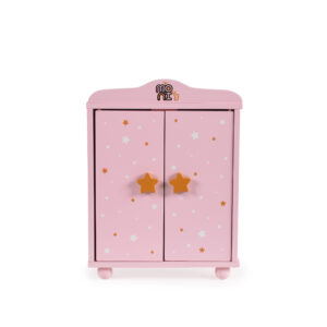 Дървен гардероб за кукли с 3 закачалки розов