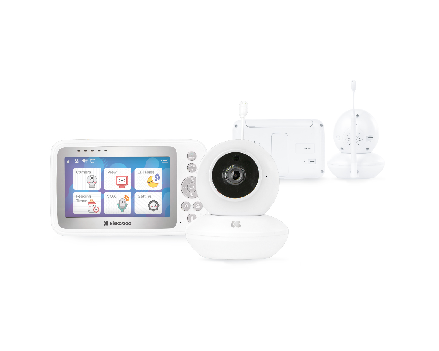 Комплектът включва: Устройство за родителя, Устройство за бебето, Огъваема стойка, Инструкция, 2 USB кабела, 1 USB адаптор и вградена батерия Lion в родителското устройство.