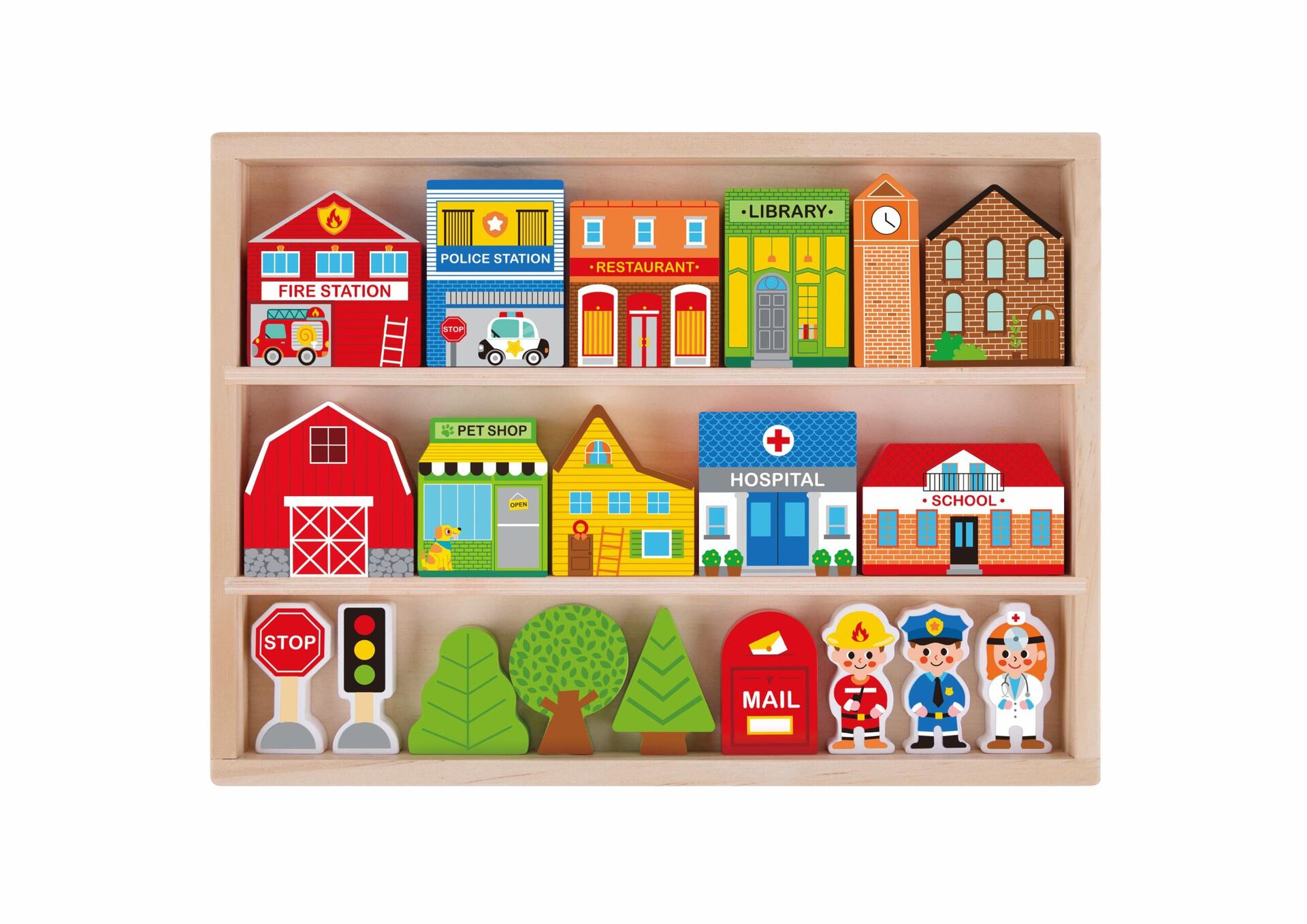 Дървен сет “Град“, от 20 части, включващ сгради, дървета, пътни знаци и фигурки на хора.