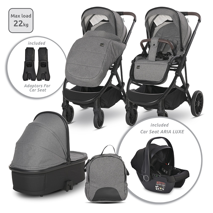 кош за новородено,подвижна поставка за крачета,реверсивна седалка,телескопична дръжка,отстраняем гриф,сгъваем сенник с допълнителна секция и козирка,прозорче на сенника,сгъваема до компактни размери,лесно сгъване,завиващи предни колела,столче за кола,спирачка на задните колела,амортисьори,голям кош за пазаруване,адаптори за столче за кола,регулируем гръб – 3 позиции,покривало,алуминиева рама,Дръжка: перфокожа,Гриф: перфокожа,Кош за новородено: алуминиева дръжка за носене,Кош за новородено: покривало,Кош за новородено: матрак /пяна 3 см/,Кош за новородено: сгъваем сенник с допълнителна секция,Кош за новородено: мрежеста част за по-добра вентилация,Кош за новородено: отстраняема тапицерия за лесно почистване,Раница за аксесоари: два външни джоба за аксесоари и мокри кърпи,Раница за аскесоари: каишки с кукички за закачане към количката,Столче за кола: ергономична дръжка за носене,Столче за кола: регулиране височината на раммените колани в две позиции,Столче за кола: 3-точков предпазен колан,Столче за кола: мека подложка за главата,Столче за кола: мека подложка за тялото,Столче за кола: сенник,Кош за новородено: допълнителен вентилационен отвор,заклюване на въртенето на предните колела,регулиране наклона на облегалката с една ръка///