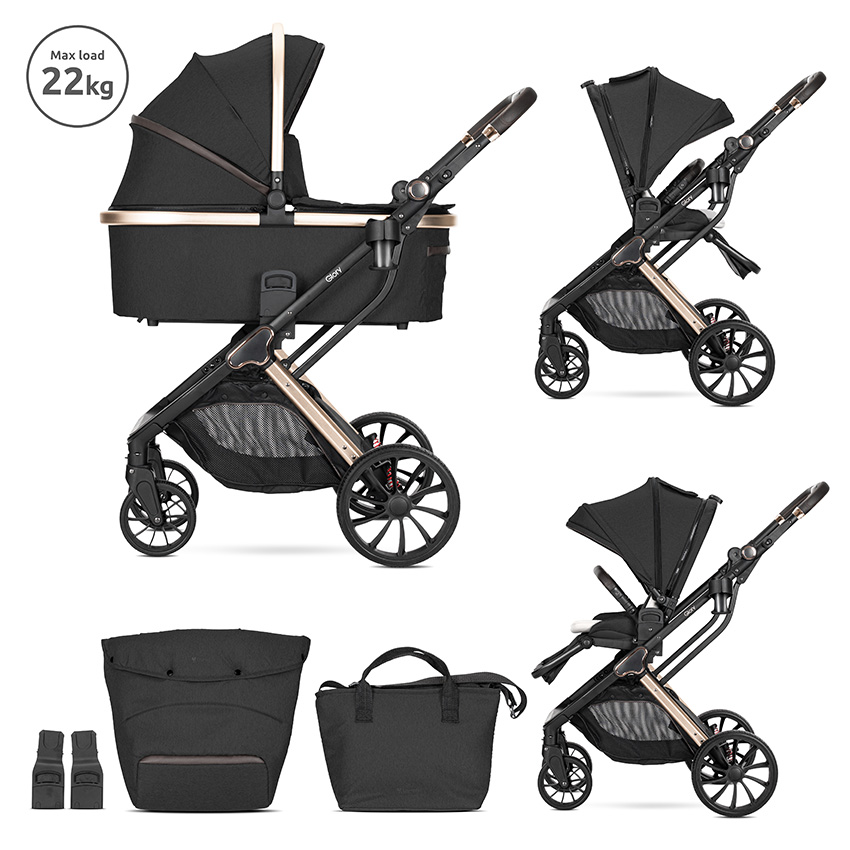подвижна поставка за крачета,амортисьори на задните колела,реверсивна седалка,размери,чанта за аксесоари,алуминиева конструкция,прозорче с капаче на сенника,мека подложка за тялото,голям кош за пазаруване,завиващи предни колела с възможност за застопоряване,Антирефлуксна система,регулируем гръб – 3 позиции,покривало,5-точков предпазен колан,гриф: ЕКО кожа,дръжка: ЕКО кожа,поставка за чаша,размери,Износоустойчиви гуми,Регулируем сенник с козирка и разширяема зона,Задни колела със синхронизирана спирачка,Опция: столче за кола ARIA LUXE (адапторите са включени в комплекта)///