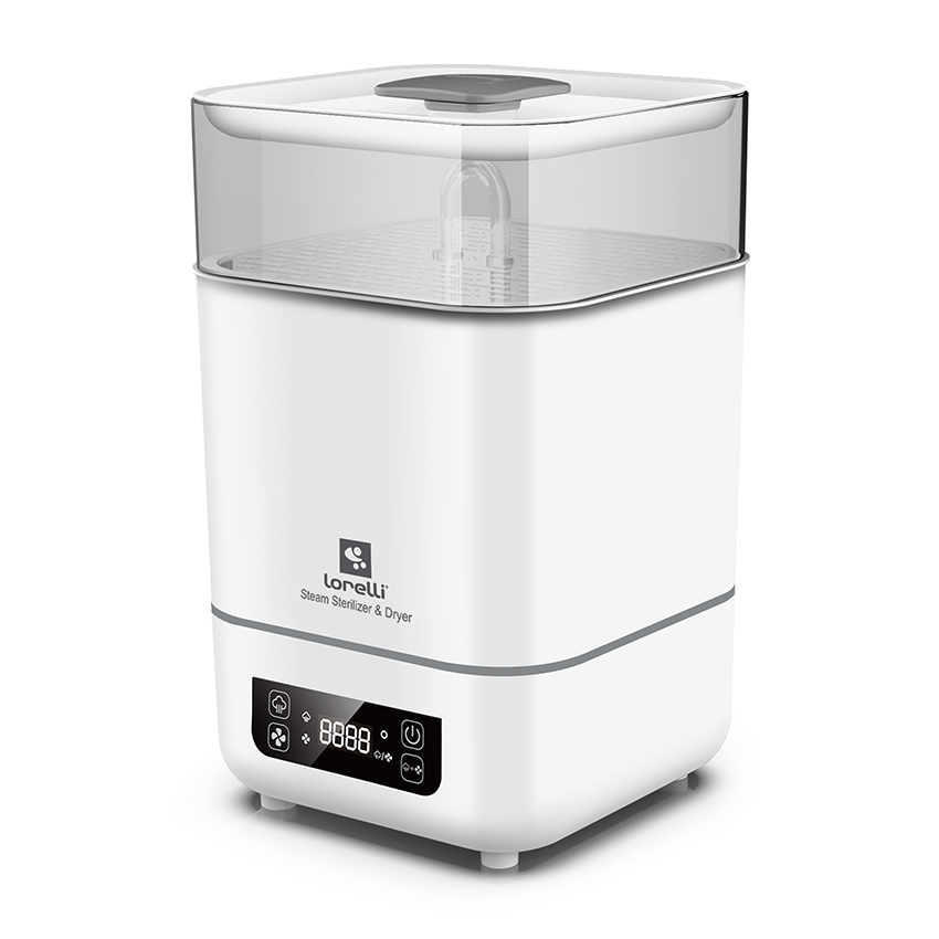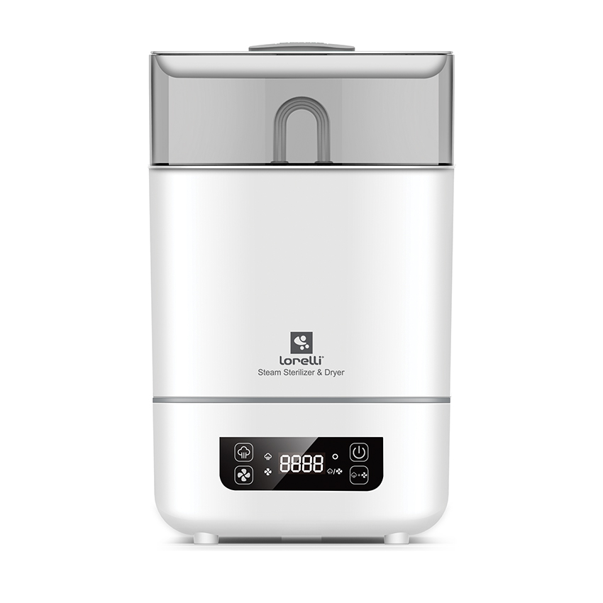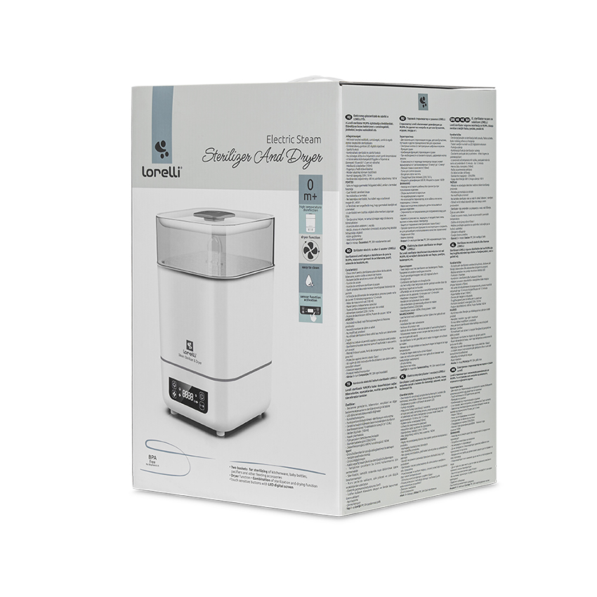 Две отделения за стерилизиране на съдове за хранене, шишета, биберони и други аксесоари за хранене,Сензорни бутони с LED цифров екран,Функция подсушаване,Комбиниране на функциите – стерилизиране и сушене,Стопиране на процесa при необходимост чрез задържане на стартовия бутон,Времетраенето на стерилизацията е 10-минутен процес (± 1-2 мин.),Мерителна чашка предвидена в комплекта ( 100 мл),Дръжка за премахване на капака,Всички части са лесни за почистване,Стандартно мрежово захранване 220V/50 Hz,Mощност при дезинфекция: 600 W, мощност при сушене: 160 W///