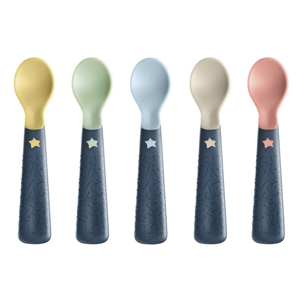 Дебелите дръжки са лесни за хващане от мъничето, като насърчават усъвършенстването на сръчността и подпомагат развитието на мускулите на ръчичките му;Комплект от 5 броя разноцветни лъжички;