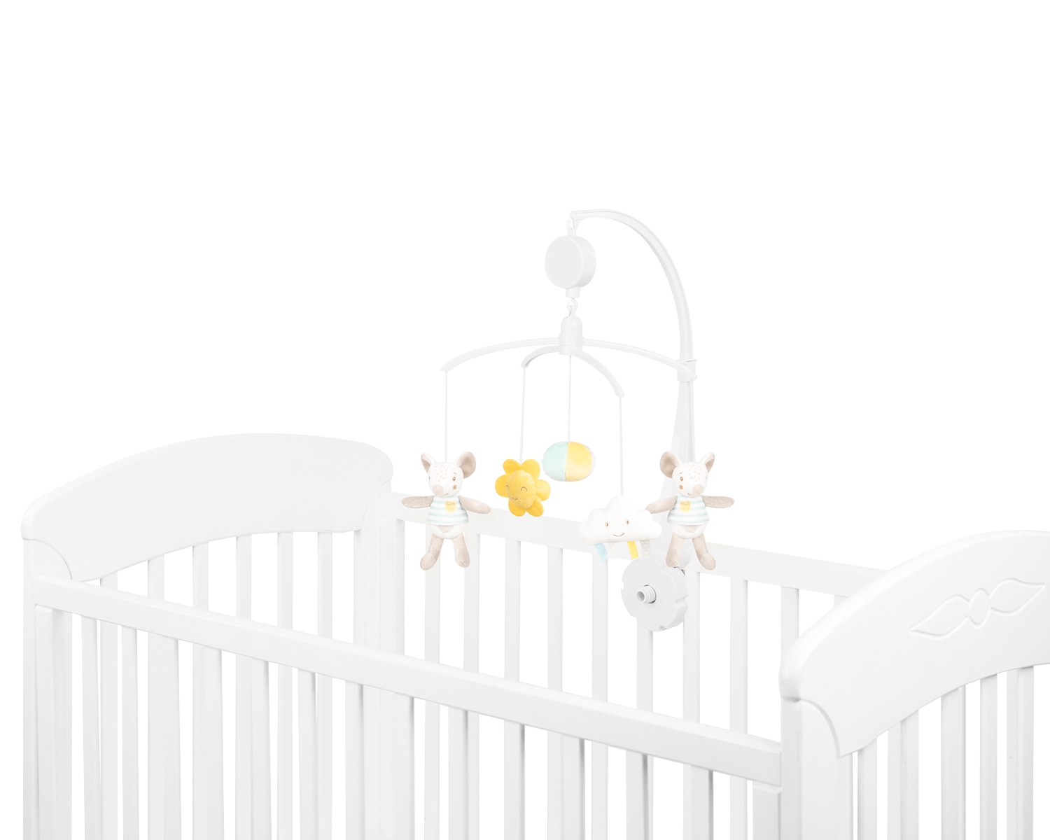 • Набирането на механизма стартира нежна приспивна мелодия и завърта цветните плюшени играчки;