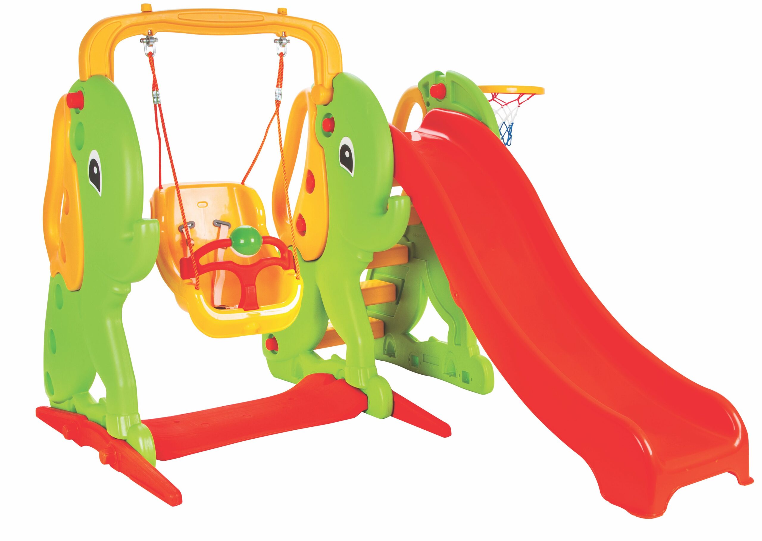 Пързалка с люлка Слонче 06161. Подходящо за деца над 1 година. Седалка с колани и предпазител, който се сваля. Баскетболен кош и топка. Максимално натоварване – 20 кг. Дължина на плъзгача: 157 см.
