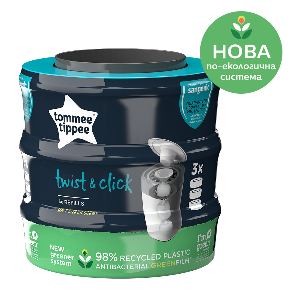 Tommee Tippee Twist & Click е единствената система за изхвърляне на пелени, която индивидуално обвива всяка пелена в многослоен антибактериален филм, за да защити дома Ви от миризмите и микробите.