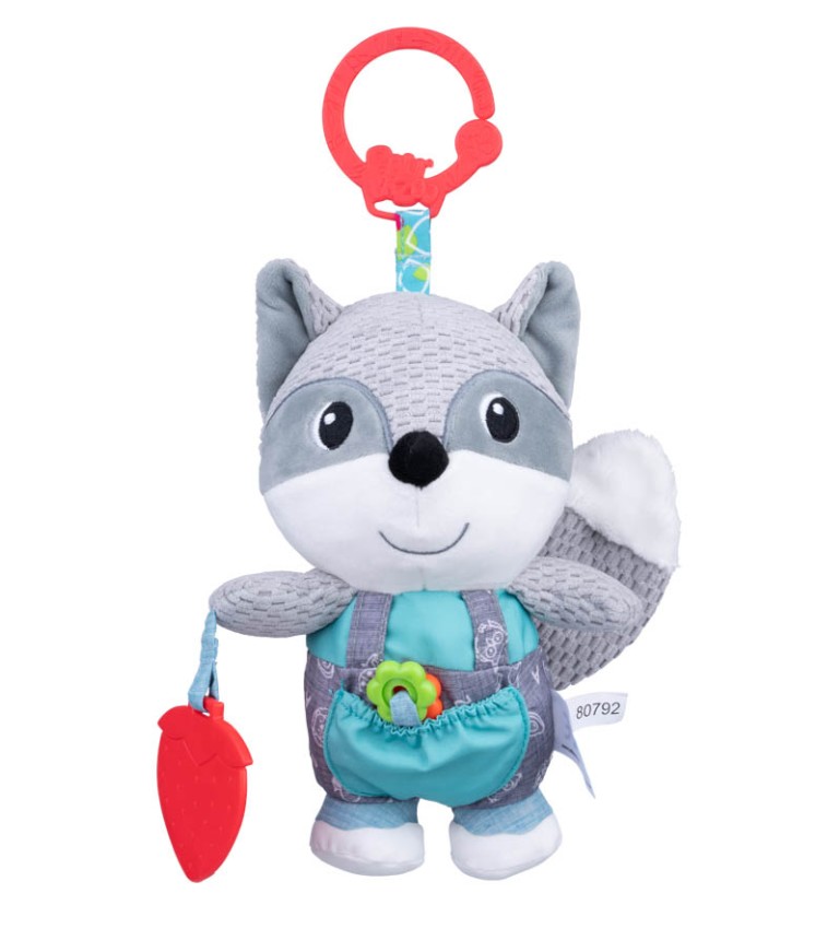 Лисицата е изработена от материали с разнообразна текстура, ушите и опашката й шумолят, а на корема има джоб, в който можете да скриете пришити за нея цветни гризалки.