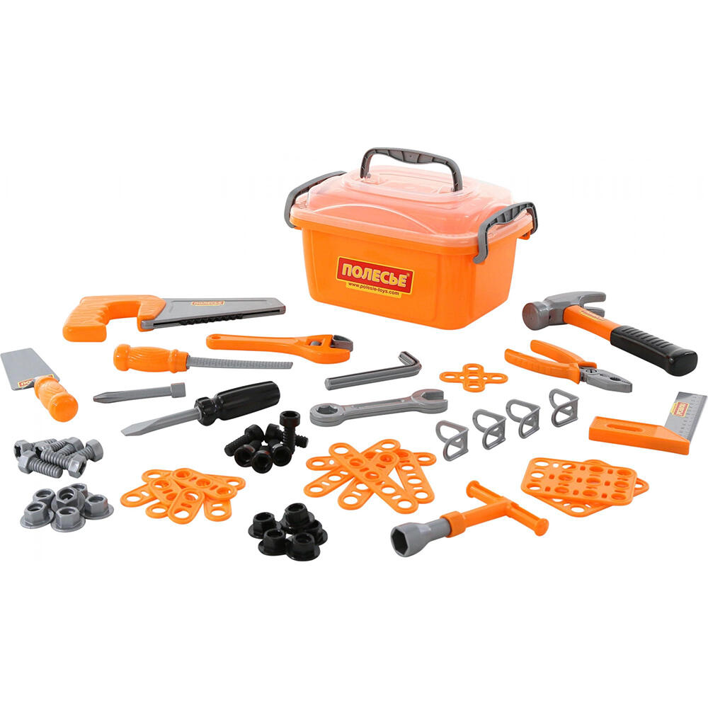 Този комплект от 57 части съдържа всичко необходимо за малкия майстор – чук, отвертки, триони, гаечни ключове, болтове, гайки и различни свързващи елементи. Всички инструменти са изработени от безопасна и устойчива пластмаса, с ярки цветове, които привличат вниманието.