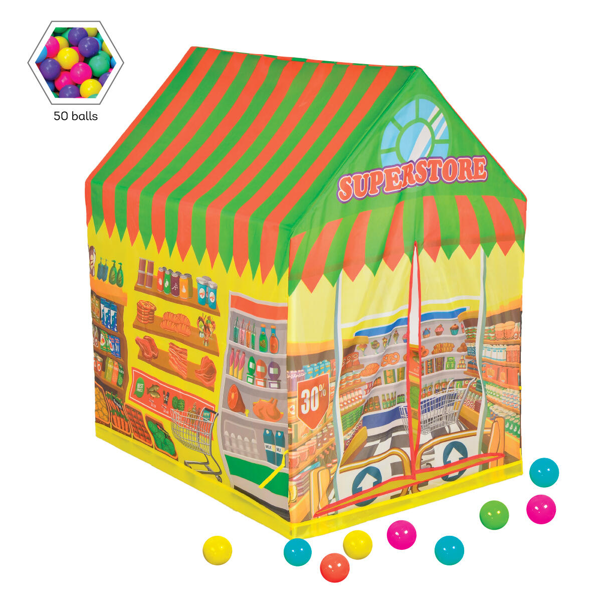 С ярък и живописен дизайн, изобразяващ интериора на супермаркет с рафтове, пълни с храни и продукти, тентата предизвиква въображението на детето и го потапя в ролеви игри.