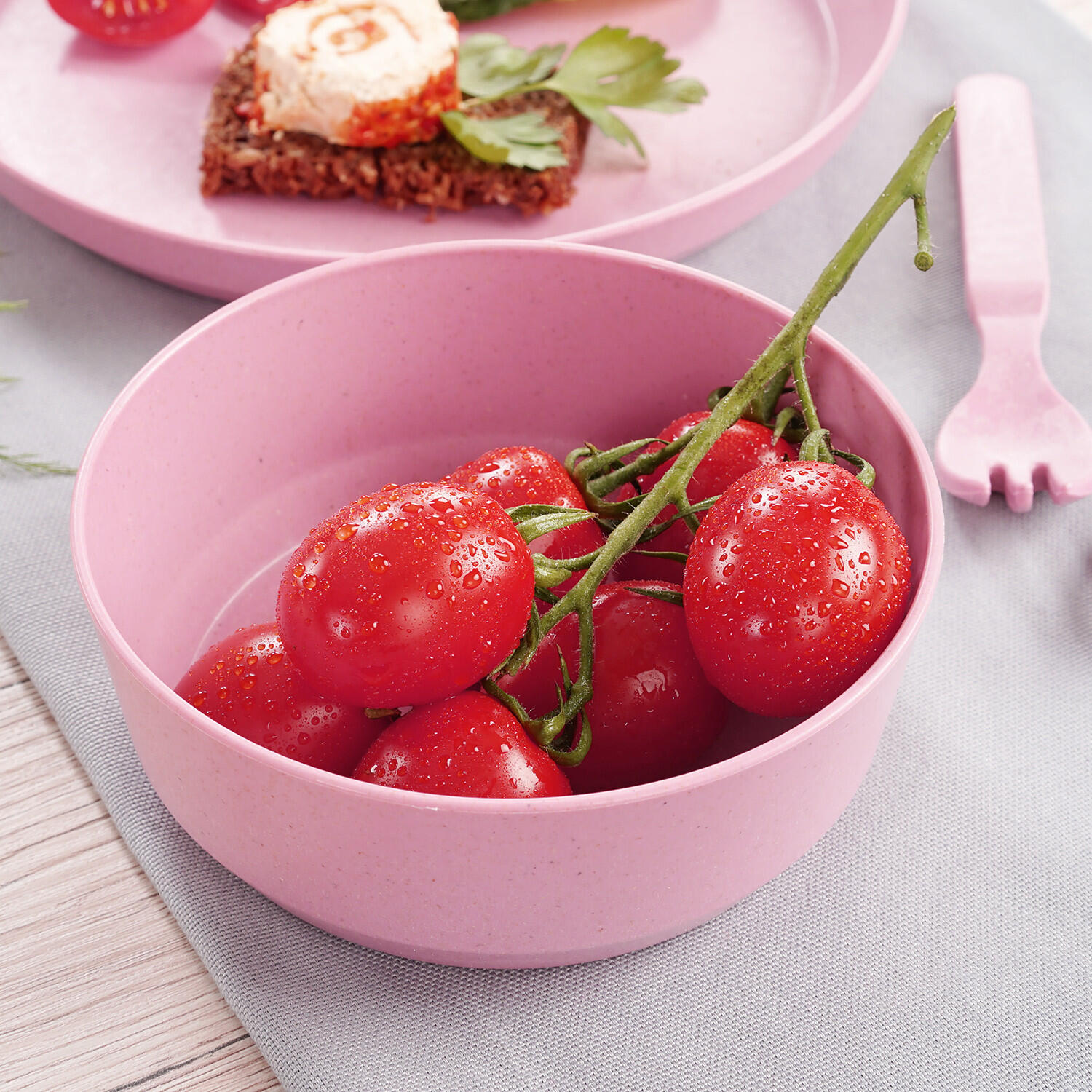 Ако храната се съхранява или загрява в съдове, съдържащи меламин, вредният меламин и формалдехид могат да се отделят от съдовете за хранене и да се прехвърлят в храната. Ето защо е особено важно да обърнете внимание не само на добрата храна, но и на материалите, използвани за съдове за хранене. Нашите съдове за хранене от серията Growing се състоят от 80% възобновяеми суровини като дърво и захар и не съдържат меламин, BPA и PVC (както е тествано от независима лаборатория за тестване).