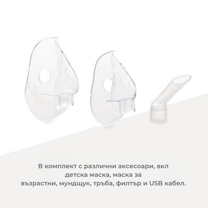 Безшумният и преносим аерозол на NuvitaMed е пълен с аксесоари: детска маска, маска за възрастни, мундщук, тръба, филтър и USB кабел