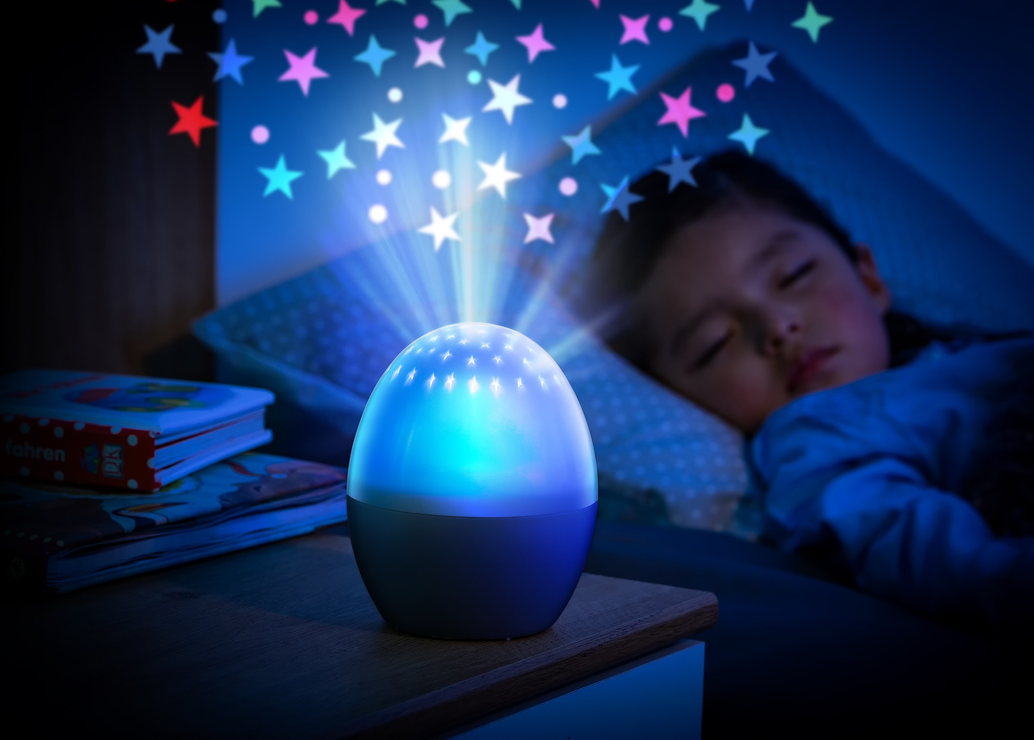 Starlino проектира успокояващ звезден образец върху тавана и създава вълшебна атмосфера в детската стая. Благодарение на автоматичната промяна на цвета, звездното небе плавно превключва между червено, зелено и синьо. Ако желаете, любимият цвят на детето може да бъде зададен с функцията за заключване. Благодарение на 3 различни нива на яркост, интензивността на звездната проекция може да се адаптира индивидуално.