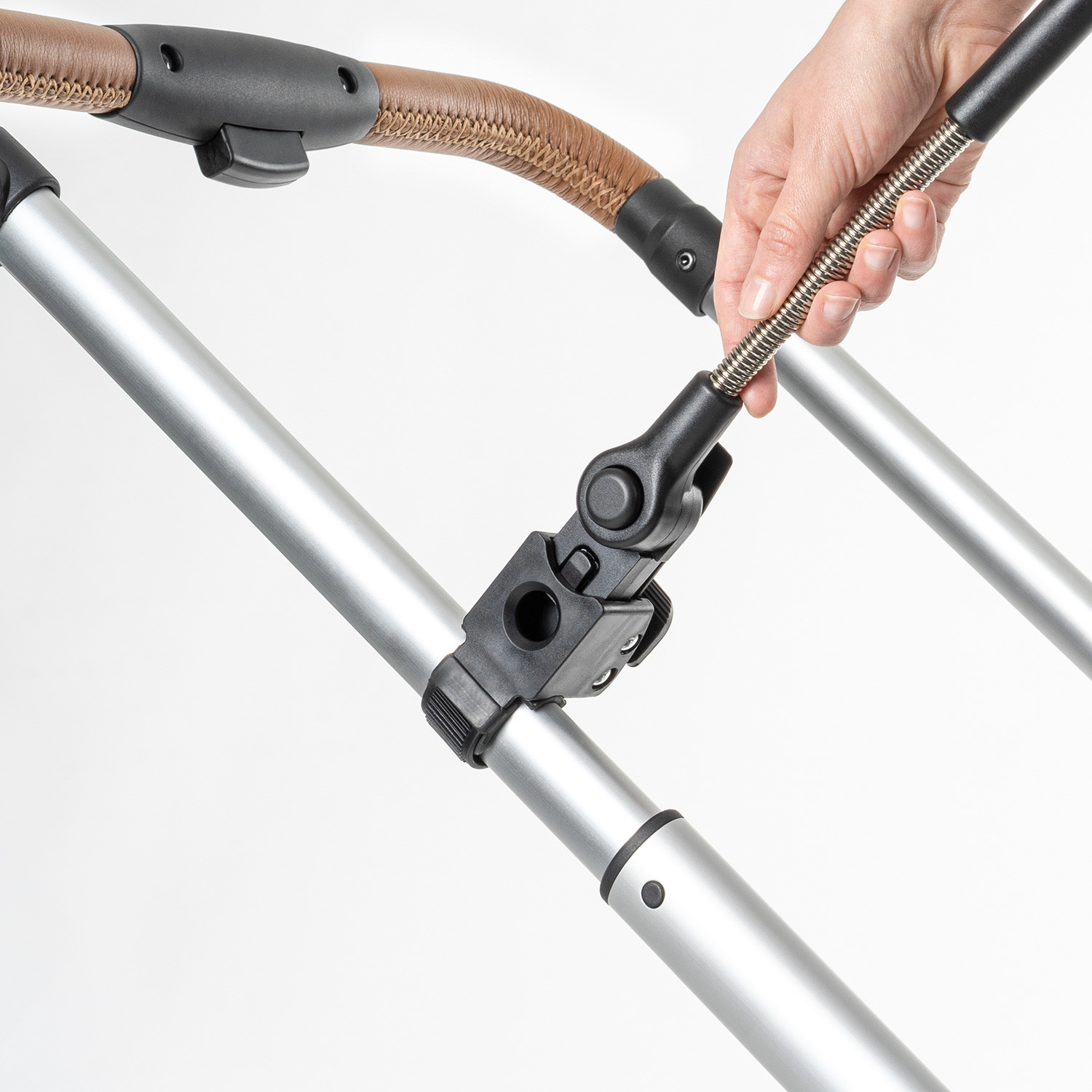Универсалният монтаж се адаптира гъвкаво към ширината на вашата рамка. Може да се монтира сигурно както към кръгла, така и към овална рамка. Чадърът пасва на всеки модел детска количка и може да бъде инсталиран навсякъде – на дръжката, на напречната лента или направо върху рамката.