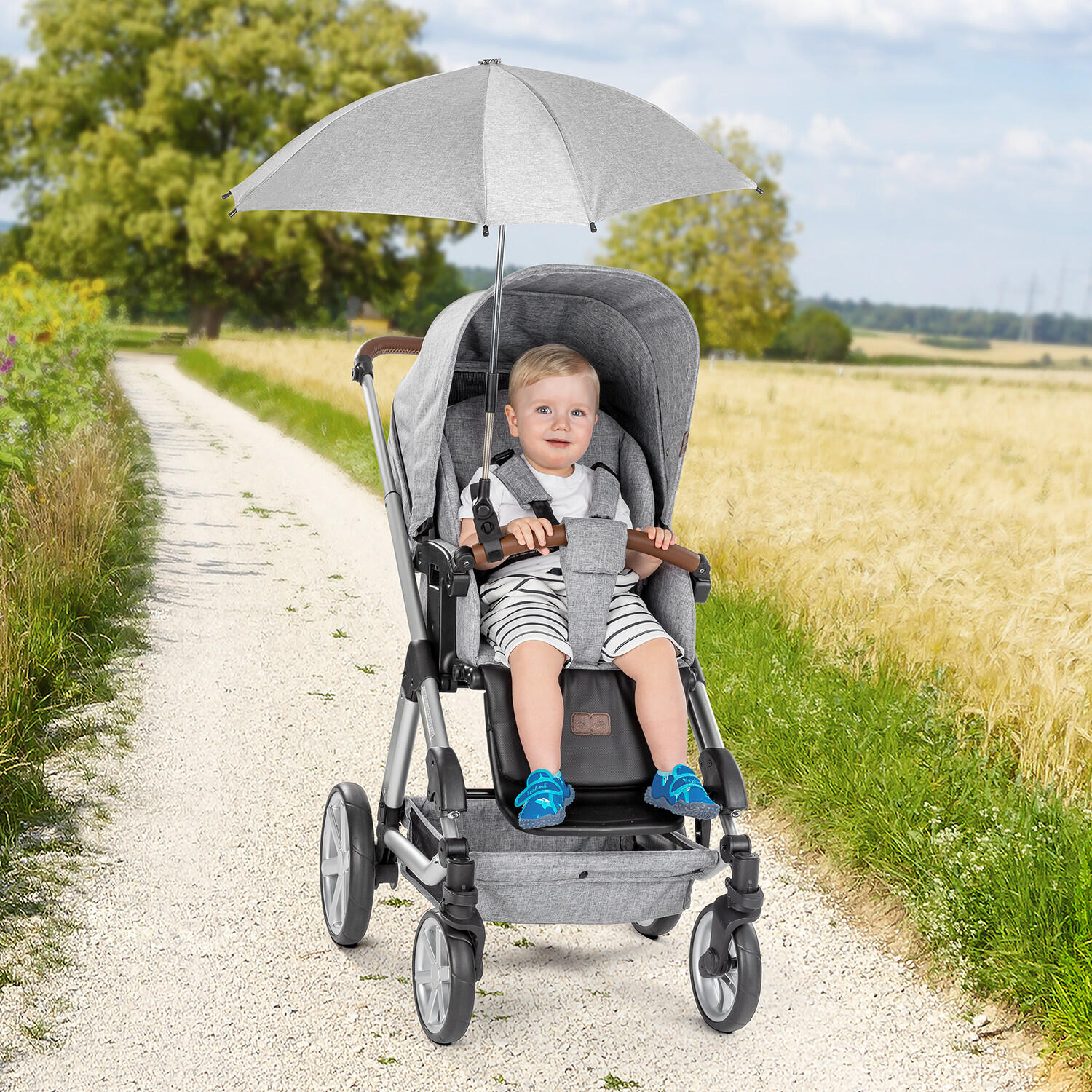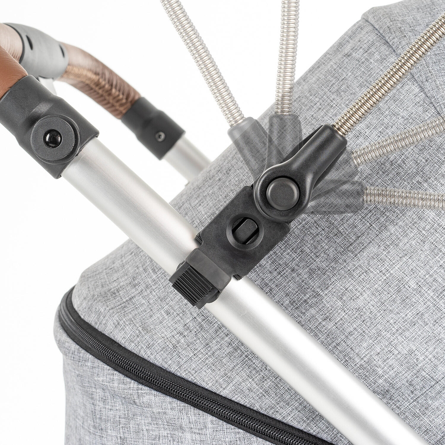 Универсалният монтаж се адаптира гъвкаво към ширината на вашата рамка. Може да се монтира сигурно както към кръгла, така и към овална рамка. Чадърът пасва на всеки модел детска количка и може да бъде инсталиран навсякъде – на дръжката, на напречната лента или направо върху рамката.