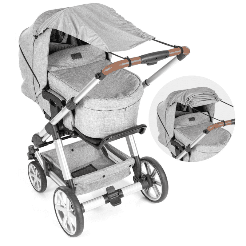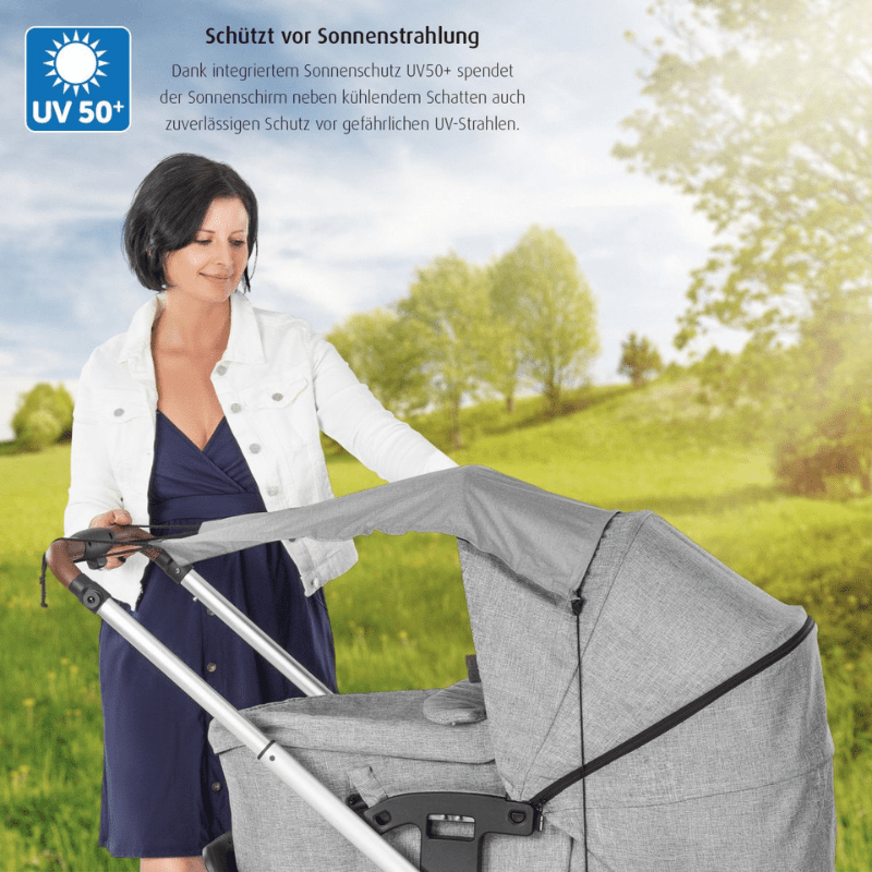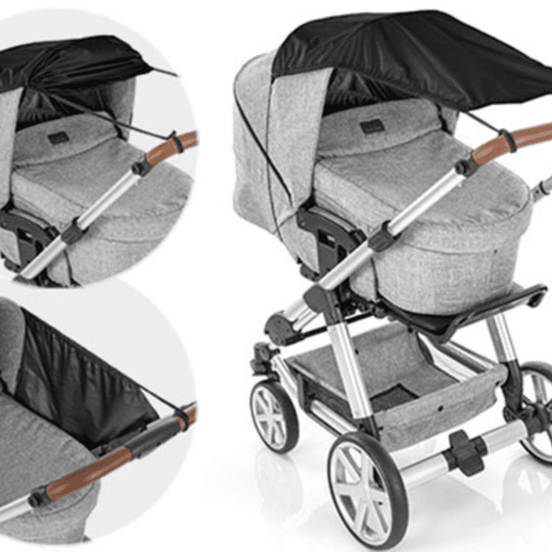 Благодарение на висококачествените материали – Платното е изработено от 100% „pogee“полиестер. Това твърдо, плътно изтъкано полиестерно влакно абсорбира до 98% от слънчевите лъчи и по този начин предлага UV защита 50+ на чувствителната бебешка кожа. Не избелява. Плътният материал предотвратява и проникването на лек дъжд.