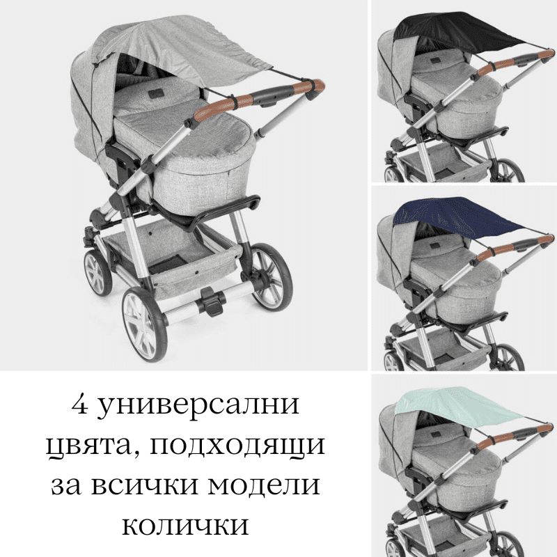 Цялостната еластична лента и ремъци за закрепване позволяват гъвкаво използване на различни модели колички, без значение от пизицията на седалката. За да прикрепите платното, поставете го над сенника, издърпайте еластичната лента и прикрепете лентите към дръжката за бутане. За сигурно задържане – дори при вятър или на неравни повърхности.