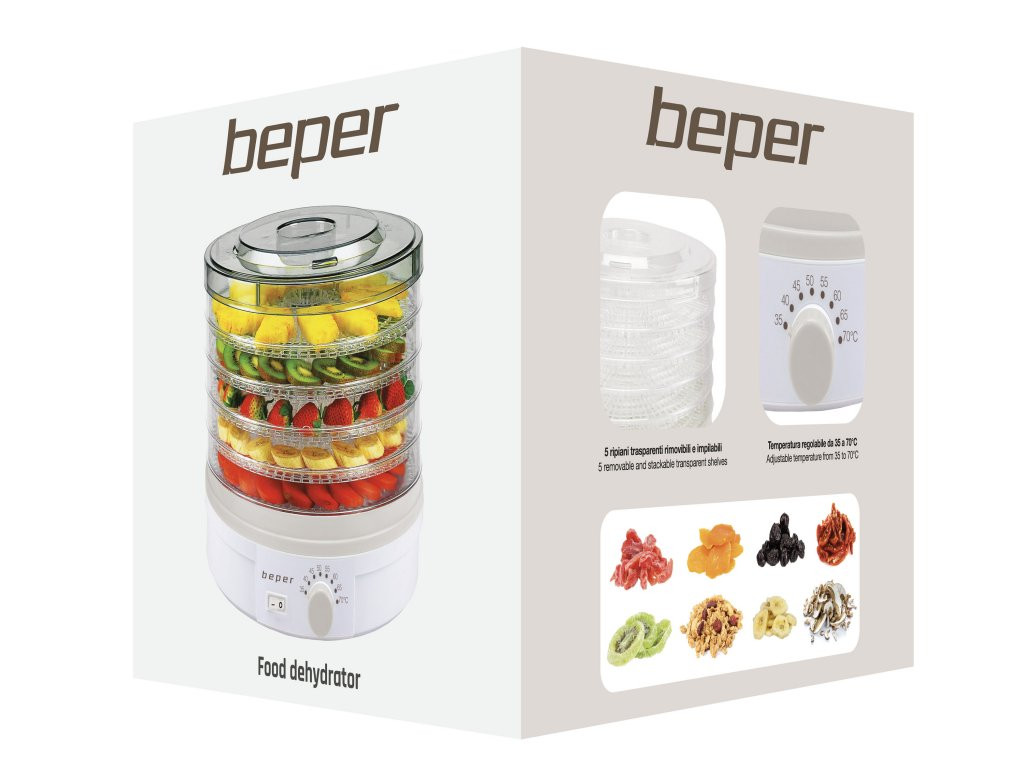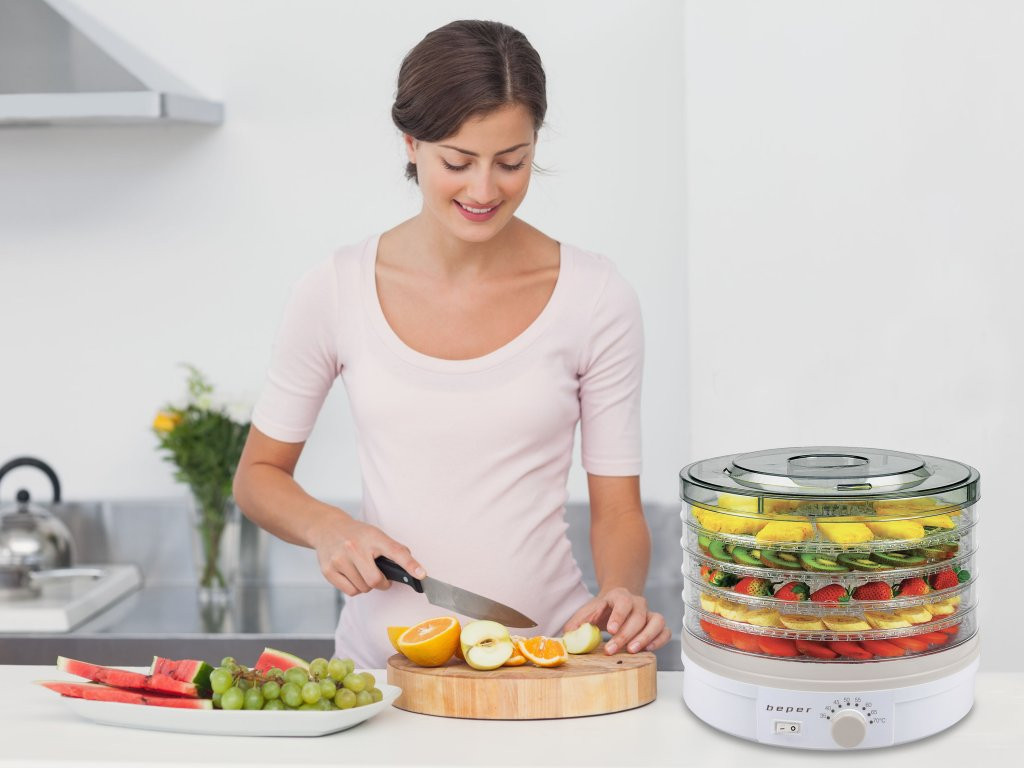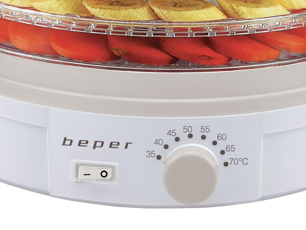Дехидратор с кръгла форма с диаметър 33 см, оборудвана с 5 прозрачни подвижни тави с вместимост 1 кг всяка. Регулируема температура в диапазон от 35C ° до 70 ° C. Чрез процеса на сушене влагата се извлича, за да запази храната и да запази хранителните й вещества непроменени. Подходящ за всички видове храни. С бутон за захранване, работна светлина и регулируема температура с практичния бутон. Безопасни за съдомиялна машина рафтове при ниска температура. Елегантен кафяв цвят.