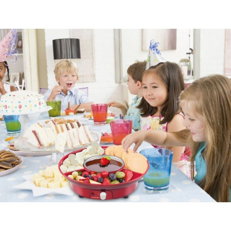 Машината разтапя шоколада и го затопля. Той е идеален за вкусни шоколадови фондюта, в които можете да потопите пресни плодове, бисквити и много други неща. Доставя се с подвижна купа от 300 ml от неръждаема стомана и пластмасова тава с 3 отделения. В комплекта има две малки вилици от неръждаема стомана.