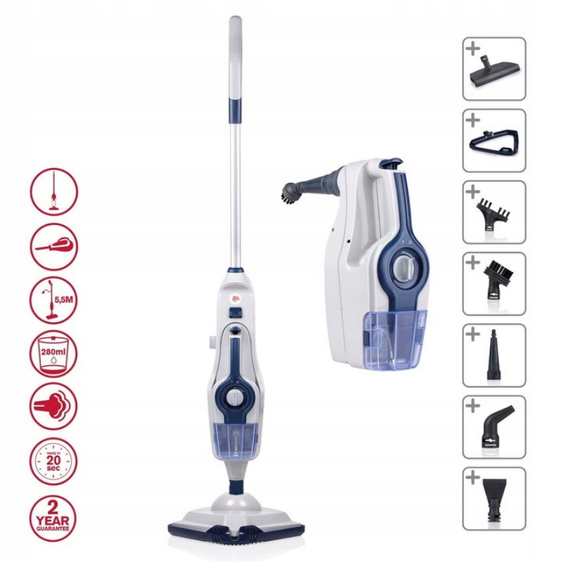 Получавате пълен комплект за почистване на цялата къща без усилия. Мопът на пара и ръчната парочистачка идват в комплект изключително полезни накрайници: четка за под, накрайник за освежаване на килими и 5 различни приставки дори за най-упоритите задачи по почистване. Резервоарът за вода е с капацитет 280 мл. Парочистачката има и резервоар за почистващ препарат с вместимост 150 ml. Пълен резервоар позволява мопът да работи около 20 мин. Това означава, че винаги имате чисти и хигиенични подове. Като премахнете дългата дръжка и използвате интегрираната дръжка, можете да превърнете парния моп в ръчна машина за пара за нула време. Като ръчен уред за пара можете да използвате парочистачката за почистване на завеси, дрехи и мебели, но също така и за премахване на петна по печката, джантите на колата и дори упорити петна от фурни.