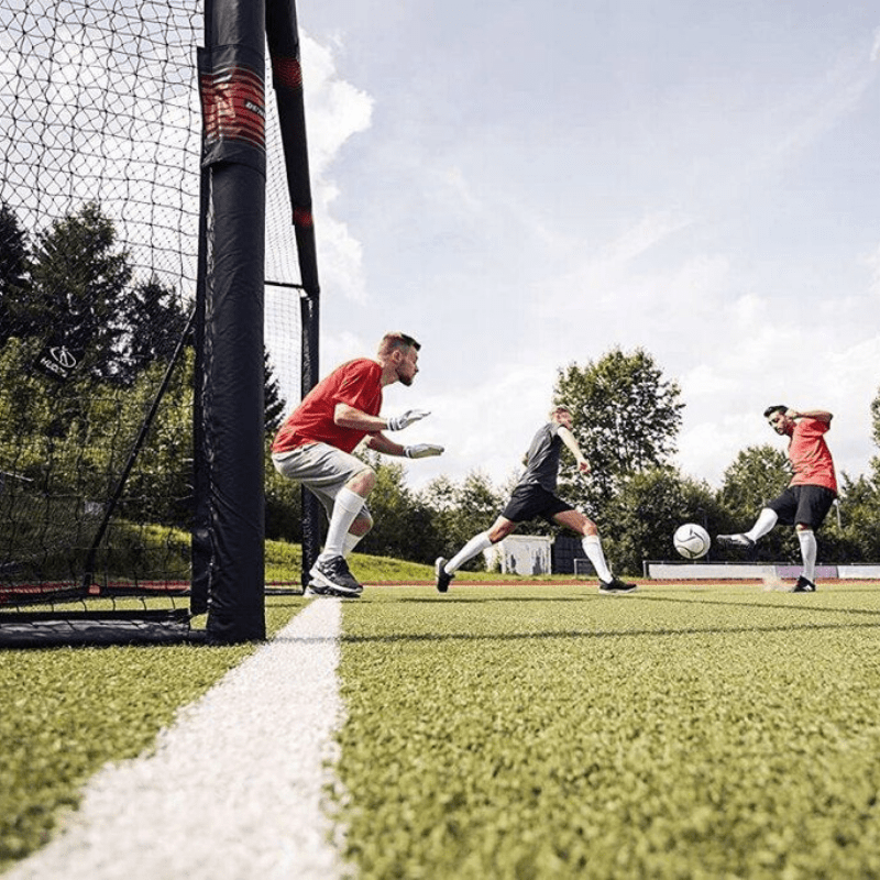 С футболната врата Dunlop можете да превърнете всяко открито пространство в истинско футболно игрище за нула време. Благодарение на удобната система за щракване и здравата стоманена рамка, можете не само да поставите футболната врата бързо, но тя е и устойчива на атмосферни влияния. Гредите на вратата Dunlop са облицовани с EPE пяна за допълнителна безопасност и за да се гарантира, че вратата няма просто да падне, са включени 6 колчета за земята. Със своите размери от 240 x 160 x 85 см, футболната врата е идеална за футболисти от всички възрасти. Ако има достатъчно място, можете да използвате вратата и на закрито.