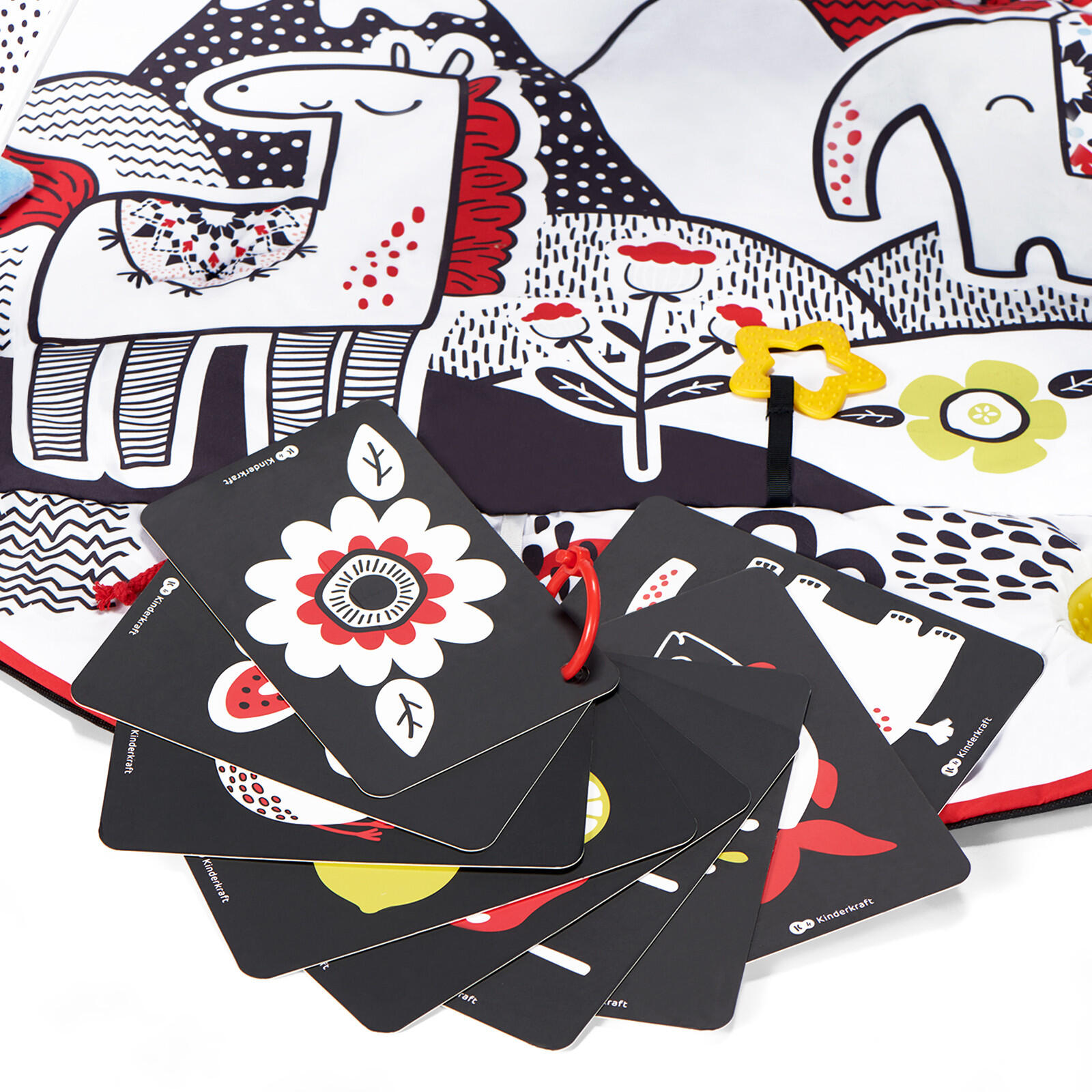 Към комплекта има 2 дъгообразни стойки, върху които могат да се поставят и свободно да се разместват добавените играчки: 12 образователни карти 4SMART, висящо огледалце, висяща топка с дрънкулка, висяща шумоляща играчка, сензорна топка, плюшена играчка, цветни ленти и дрънкащи топчета и огледалце, което може да се постави под прозрачното фолио. Картите са със закопчалка тип халка за ключодържател – могат да се закачат напр. на количка или раница. Допълнително в комплекта има топка със сензори. Тя е голяма, с различни цветове, бутончета и шарки, благодарение на което ще прикове погледа на малчугана и ще му достави много радост. Интересните шарки и стил, както и многофункционалността, правят постелката идеална за всяко дете.