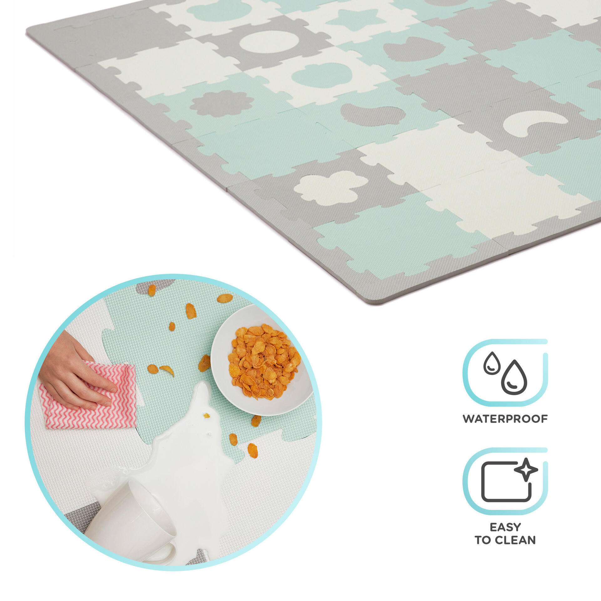 LUNO гарантира, че вашето малко дете се забавлява, докато вие имате момент за себе си. Не е нужно да се притеснявате за безопасността на детето или… състоянието на пода. Постелката осигурява защита срещу петна от течност и храна, като ги задържа върху повърхността от пяна. Просто избършете с кърпа и можете да се върнете към играта.