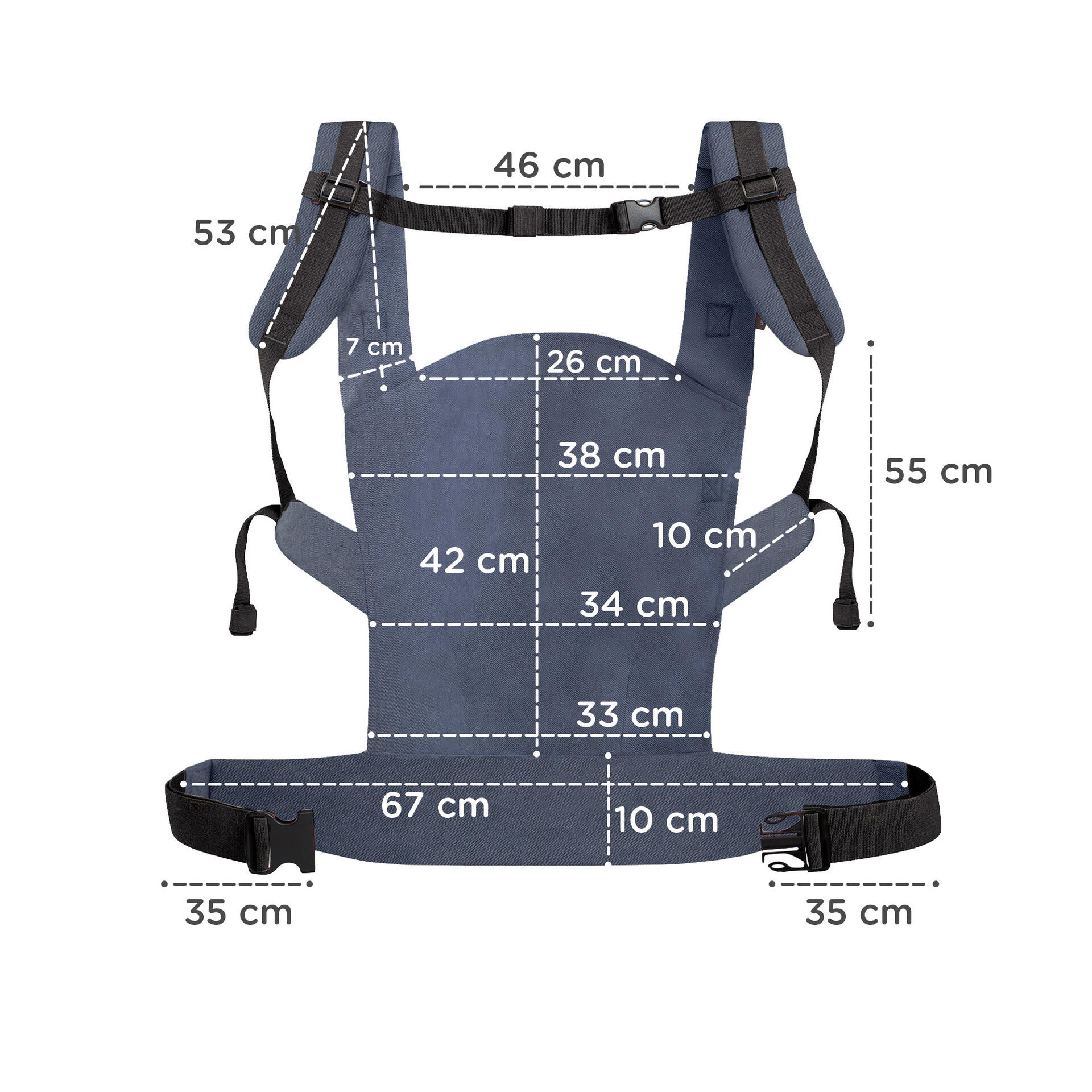 Теглото на детето се разпределя равномерно от ремъка, снабден с възглавнички. Мекият пълнеж на лентите гарантира оптимално налягане върху бедрата и раменете.