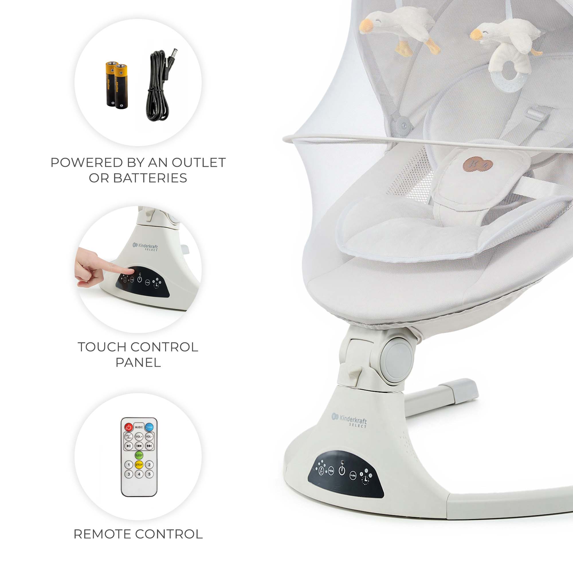 TULSY ви дава избор. Управлявайте люлеещата се люлка удобно отвсякъде с дистанционното управление или използвайте сензорния панел. Това е огромно удобство! Интуитивният тъчпад и дистанционното управление улесняват регулирането, докато Bluetooth и USB ви позволяват да възпроизвеждате любимата музика на вашето бебе. Люлеещата се люлка разполага и с вече качени мелодии, включително звуци от природата.