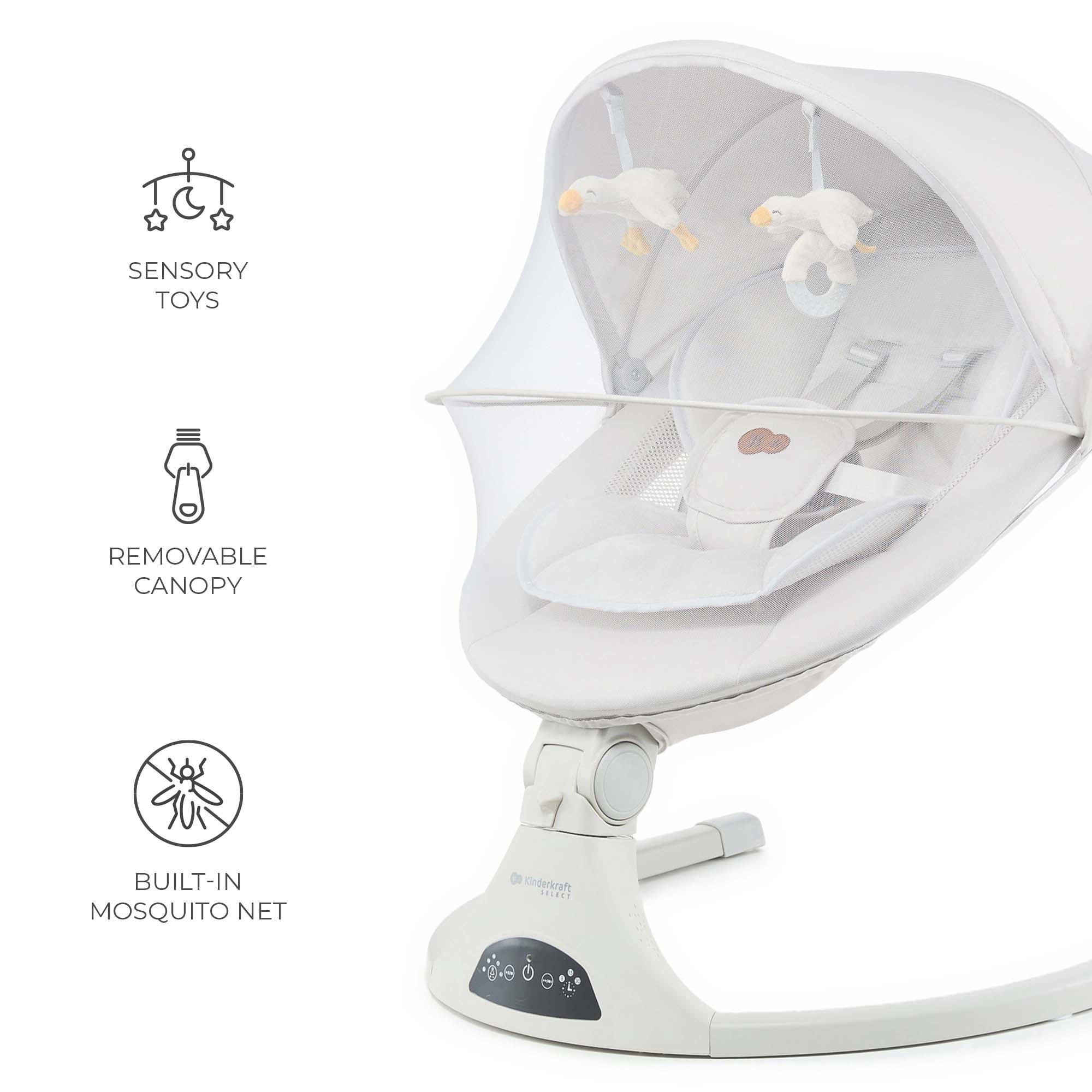 TULSY е модерен електрически шезлонг, който осигурява комфорта на вашето мъниче и улеснява ежедневието на родителите. С 5-степенна настройка на скоростта на люлеене и таймер, можете лесно да регулирате движението според нуждите на вашето бебе. Сензорният панел и дистанционното управление осигуряват лесно и интуитивно управление,  а в допълнение  Bluetooth и USB функциите позволяват да слушате любимата си музика. 3-точковото регулиране на облегалката, меката подложка и 5-точковият предпазен колан осигуряват ергономична опора и безопасност. TULSY тежи само 3,93 кг, което прави транспортирането му лесно. Интегриран с мрежа против комари и подвижни играчки, добавя допълнителен комфорт и забавление. Това е интелигентна опора за родителите и спокойна почивка за мъничето!