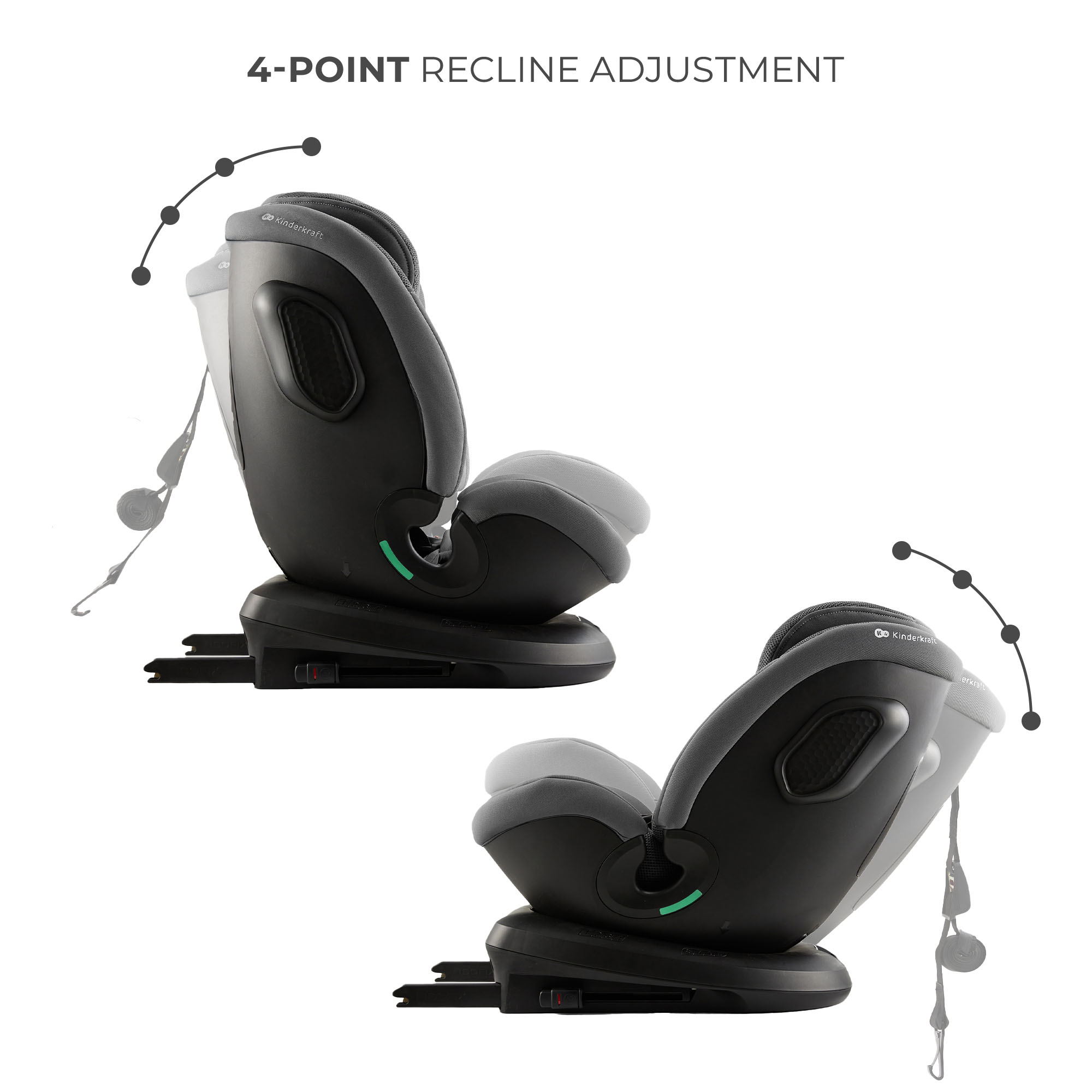 Функцията RECLINING позволява регулиране на облегалката на столчето за кола с 4-степенно регулиране на наклона на седалката в двете позиции RWF и FWF, което позволява на детето да заеме удобна позиция, докато спи или когато е активно.