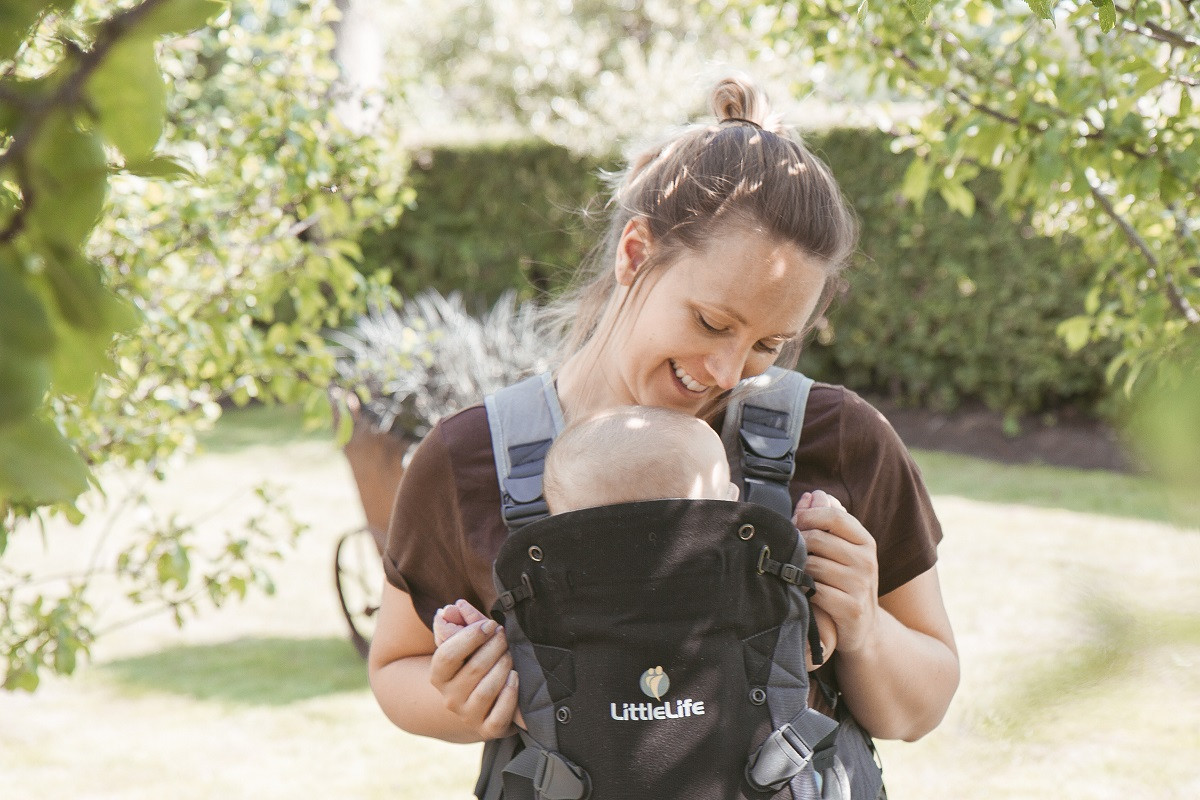 За новородени – напълно затворена, за да се гарантира правилното поставяне на бедрата и краката в „М позиция“, поставете бебето високо на гърдите си (така че да можете да целунете главата му). Уверете се, че опората на главата е в изправено положение