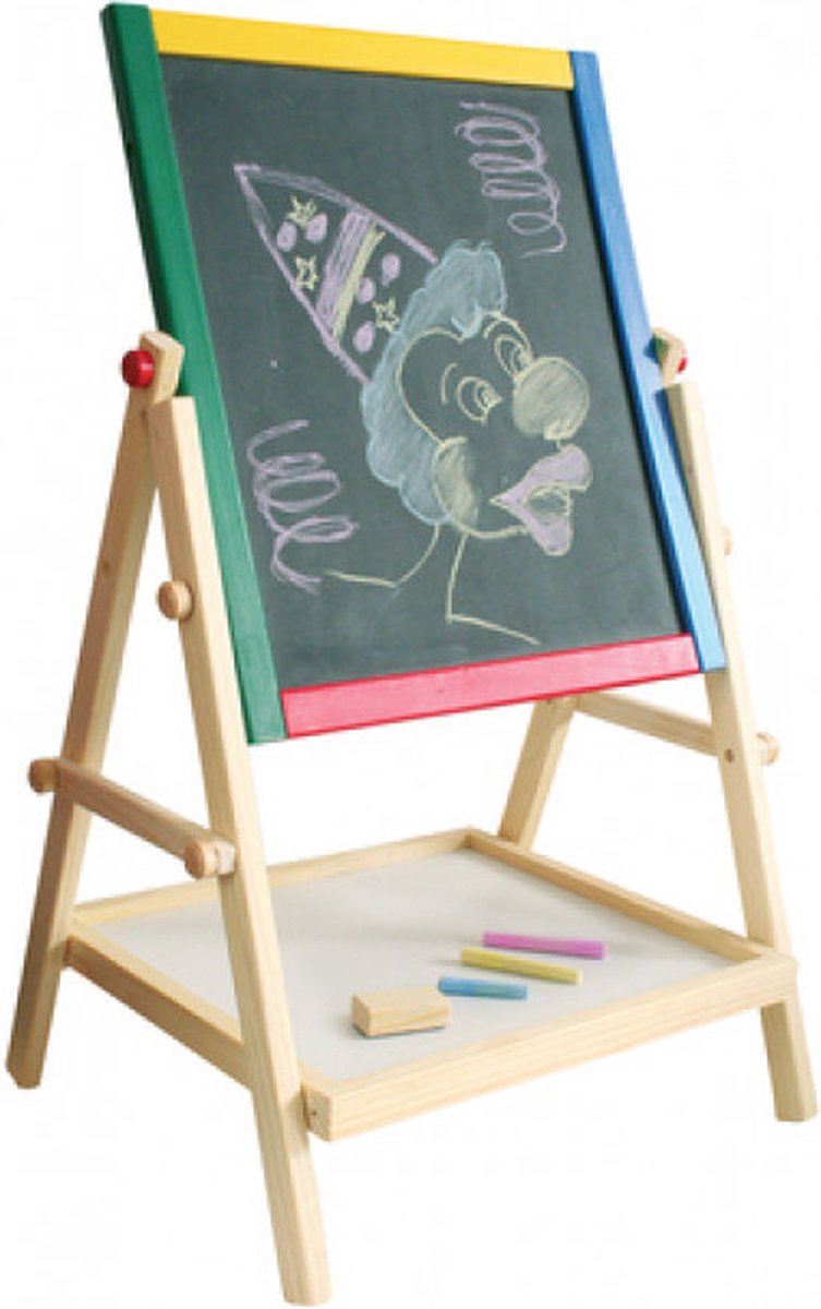 Вашето дете може да се изразява творчески с цветната дъска. Благодарение на включените аксесоари, момчетата и момичетата могат да създават малки произведения на изкуството върху удобната дъска с възможност за двустранно ползване. Детската дъска е с голяма площ бяла и класическа черна страна. И двете повърхности са магнитни. Удобна табла за съхранение на маркери, тебешири, гъба и други.